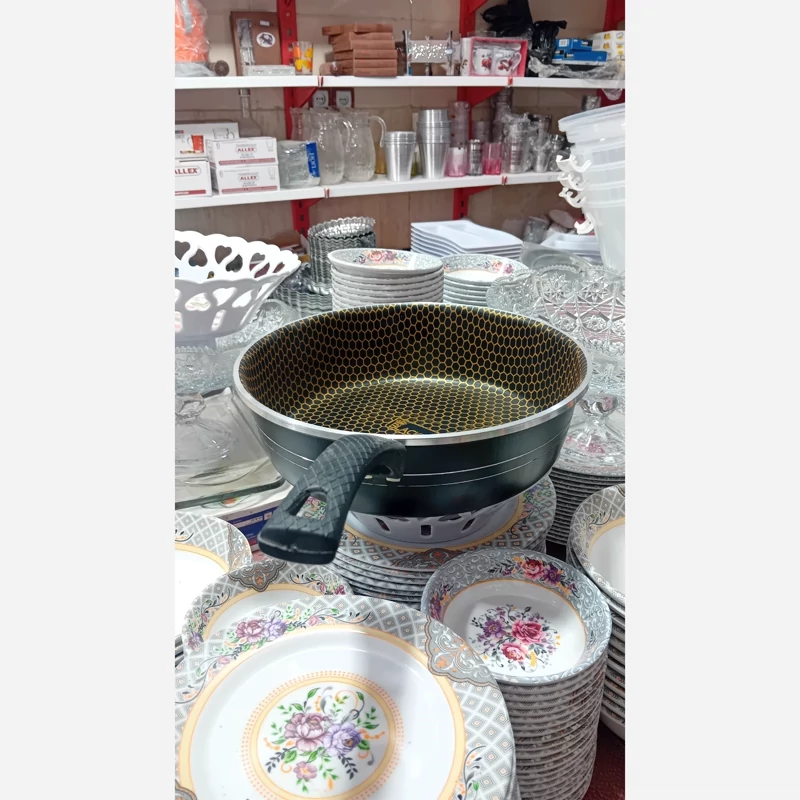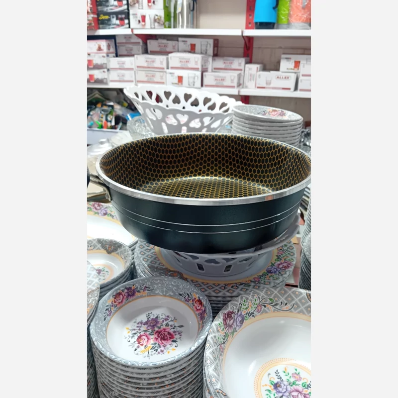 ماهی تابه نسوز جنس وکیفیت بالا طراحی مناسب وزیبا دسته ی محکم سایزبزرگ رنگ مشکی قیمت مناسب وبه صرفه مناسب سرخ کردن استفاده دراشپزخانه ارسال به سراسرکشور